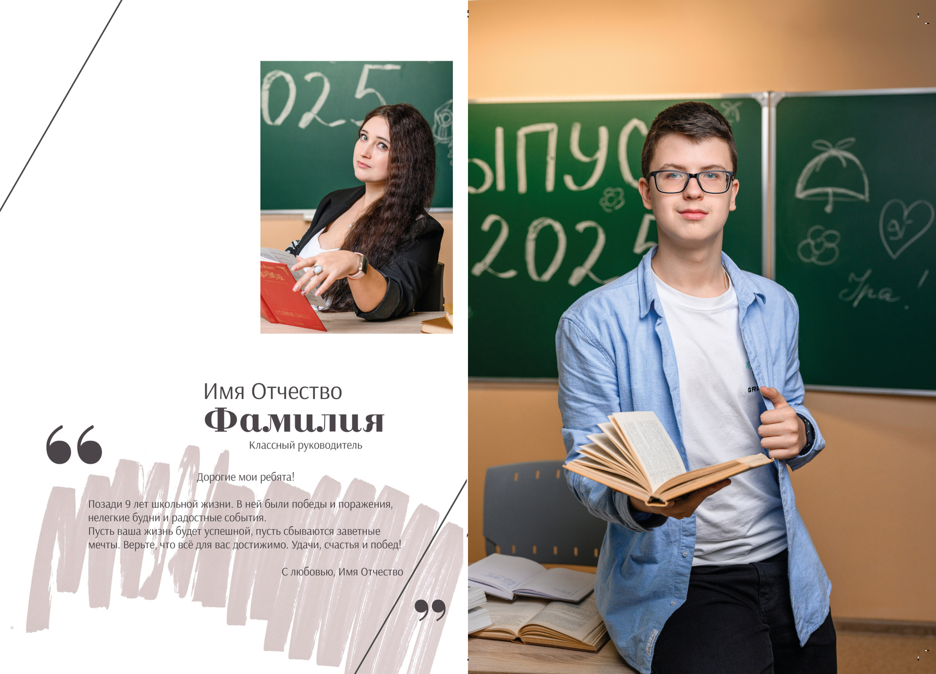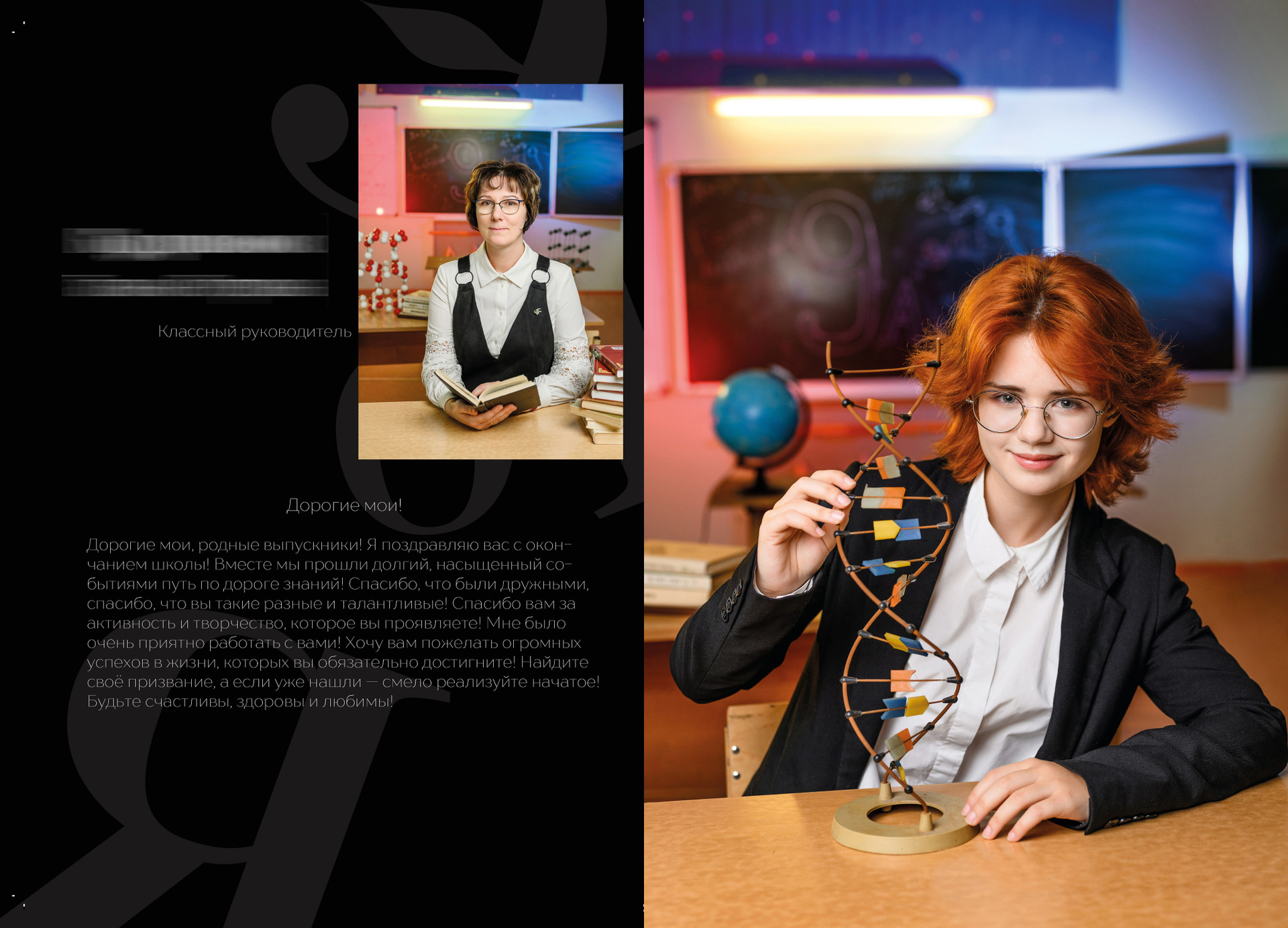 Страницы № 2-3 — фотография классного руководителя с пожеланием для выпускников